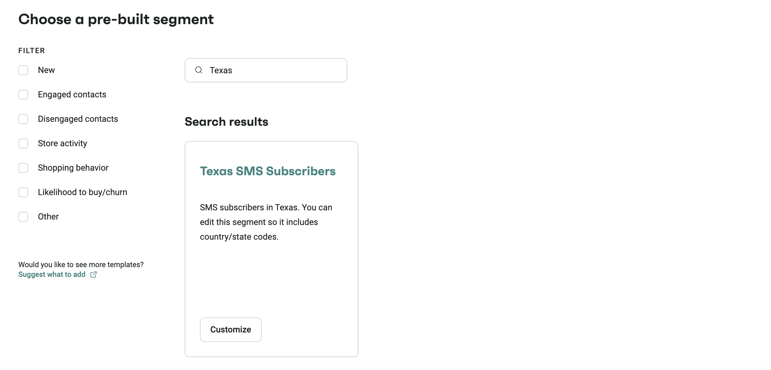 Since businesses sending promotional SMS/MMS messages to Texas residents must comply with Senate Bill 140 (SB 140) from September 1st, we have created a pre-built template for the Texas SMS Subscribers segment. Now, it's even easier to locate and exclude Texas-based contacts from your communication.