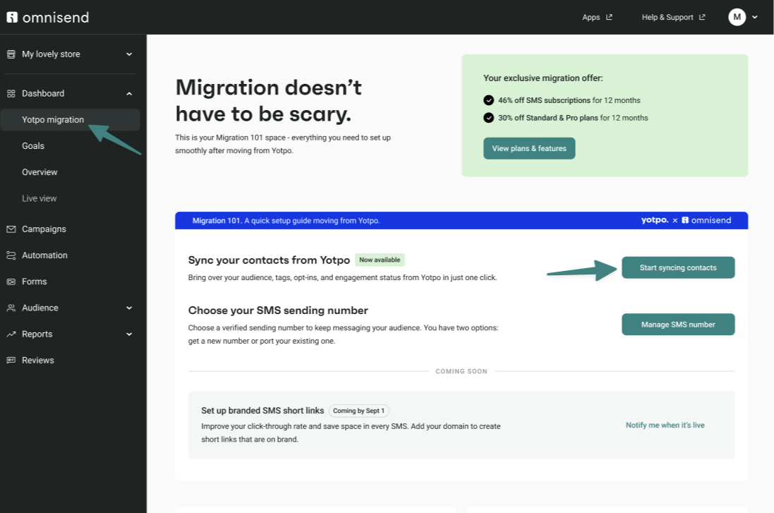 If you are migrating from Yotpo to Omnisend and your store runs on Shopify, you can move your contacts automatically with just one click. In your Omnisend account, go to: Dashboard → Yotpo migration → click Start syncing contacts.