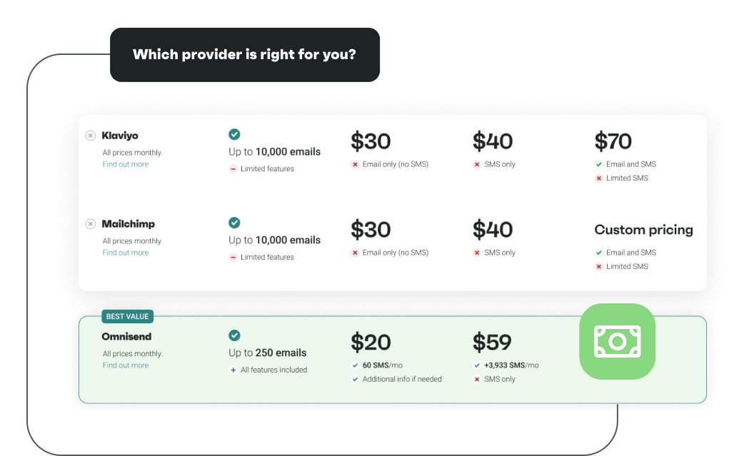 Don't just take our word for it — see how much you'll save with Omnisend by comparing our email & SMS pricing with other email providers.