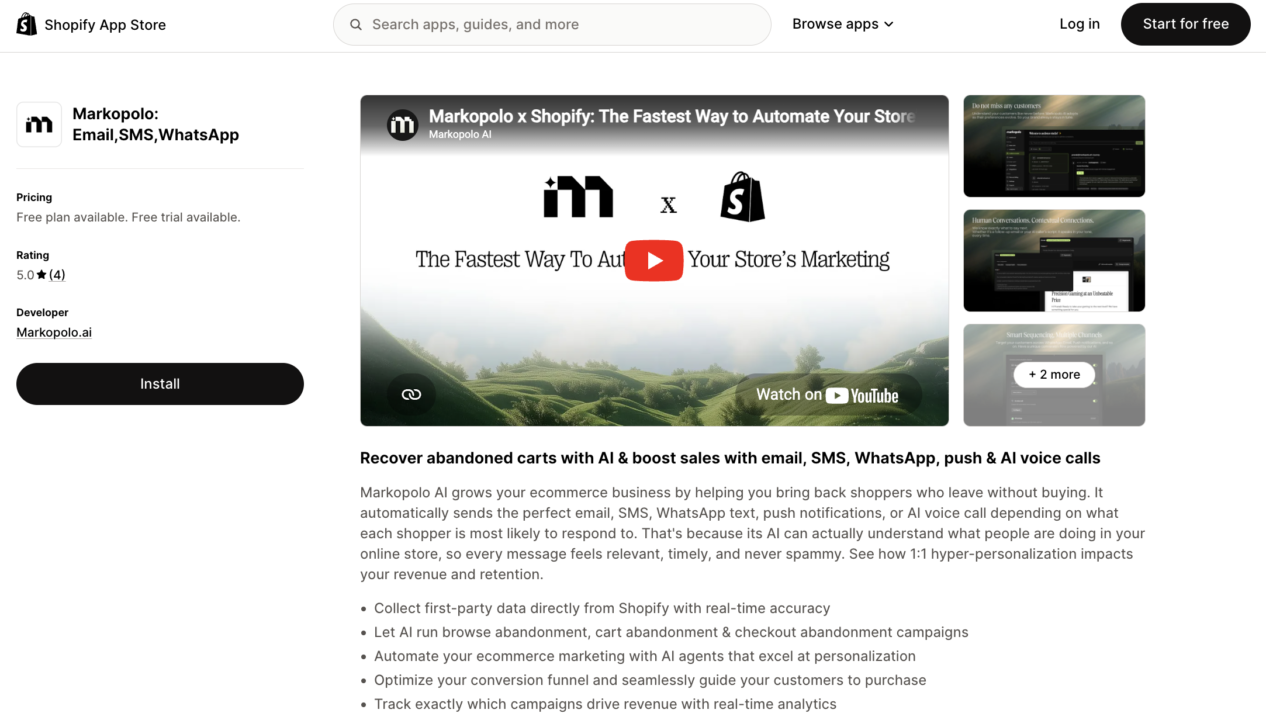 Markopolo AI automates abandoned cart recovery through email, SMS, WhatsApp text, push notifications, and AI voice calls. It has a built-in behavioral intelligence layer which collects first-party data from Shopify stores and interprets user behavior using AI. This helps ecommerce and d2c businesses drive customer retention through hyper-personalized, omnichannel marketing.