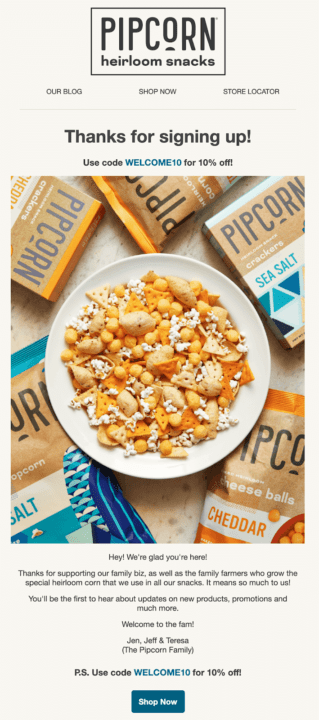 What I love about this email: The founders’ photo and signature add a personal touch, making the brand feel more authentic. Also, see how the messaging appeals to health and fitness lovers? It makes sure to focus on solving healthy snacking issues.