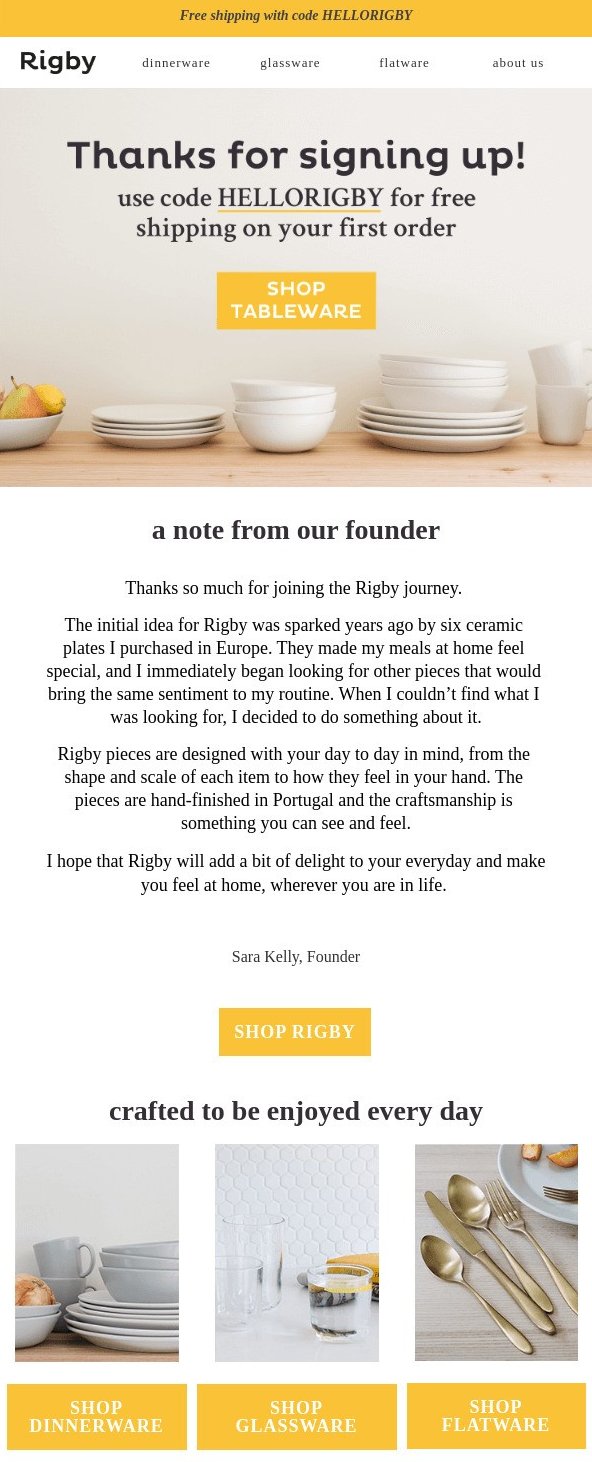 What I love about this email: The email’s header instantly makes me feel like I’m part of something special, not just another name on a list. Adding a personal message from the founder makes the brand feel even more human and relatable.