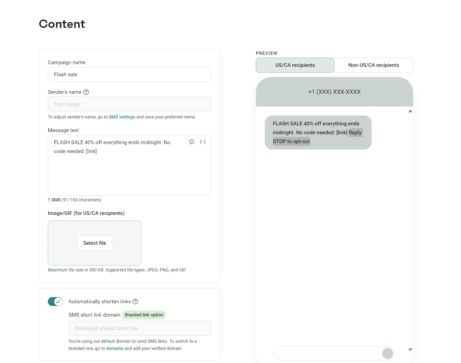Omnisend’s bulk texting tool lets you create standalone SMS or MMS campaigns with an intuitive content builder, which walks you through everything and provides a real-time illustration of how your text message looks: