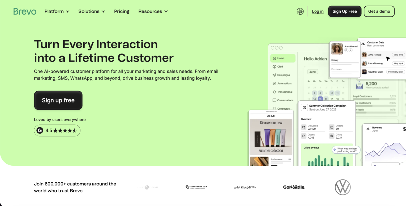 Brevo is a powerful Klaviyo alternative for growing ecommerce brands that want to consolidate their tech stack. Rather than focusing solely on email, Brevo provides a complete all-in-one customer platform that brings together email, SMS, WhatsApp, and web push, allowing merchants to unify their messaging under one roof.