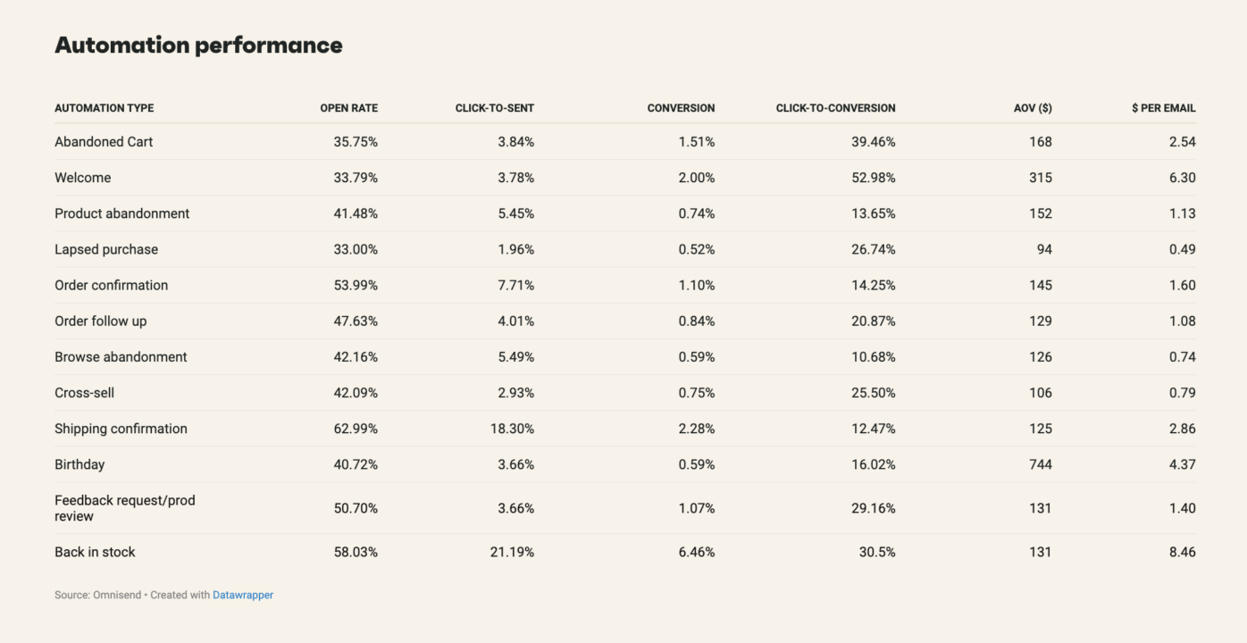 - Back in stock emails (58.03%): These emails are sent to customers who’ve previously expressed interest in a specific product, making them relevant and likely to be opened.