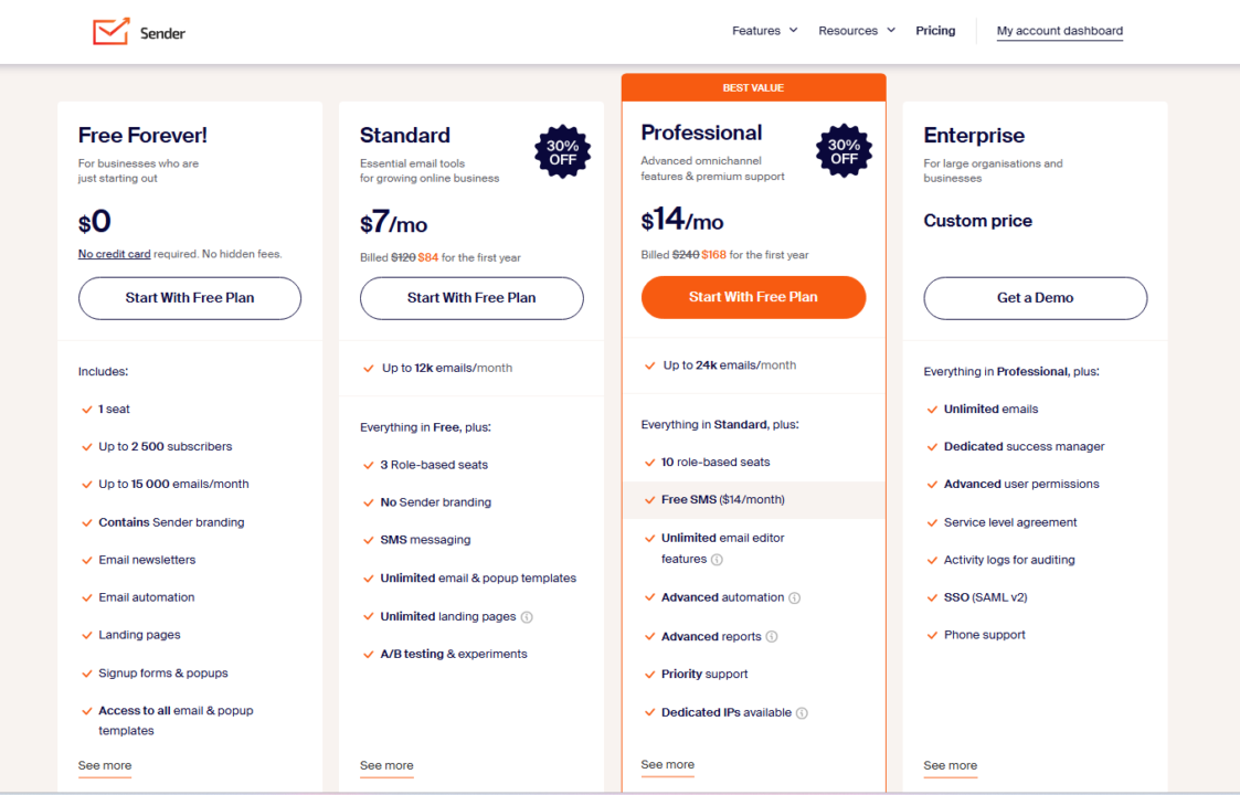 Sender offers a generous Free Forever plan with all the essential tools businesses need to grow without breaking the bank. Paid plans start from $7/month, unlocking advanced features like A/B testing, unlimited landing pages, and SMS campaigns.
