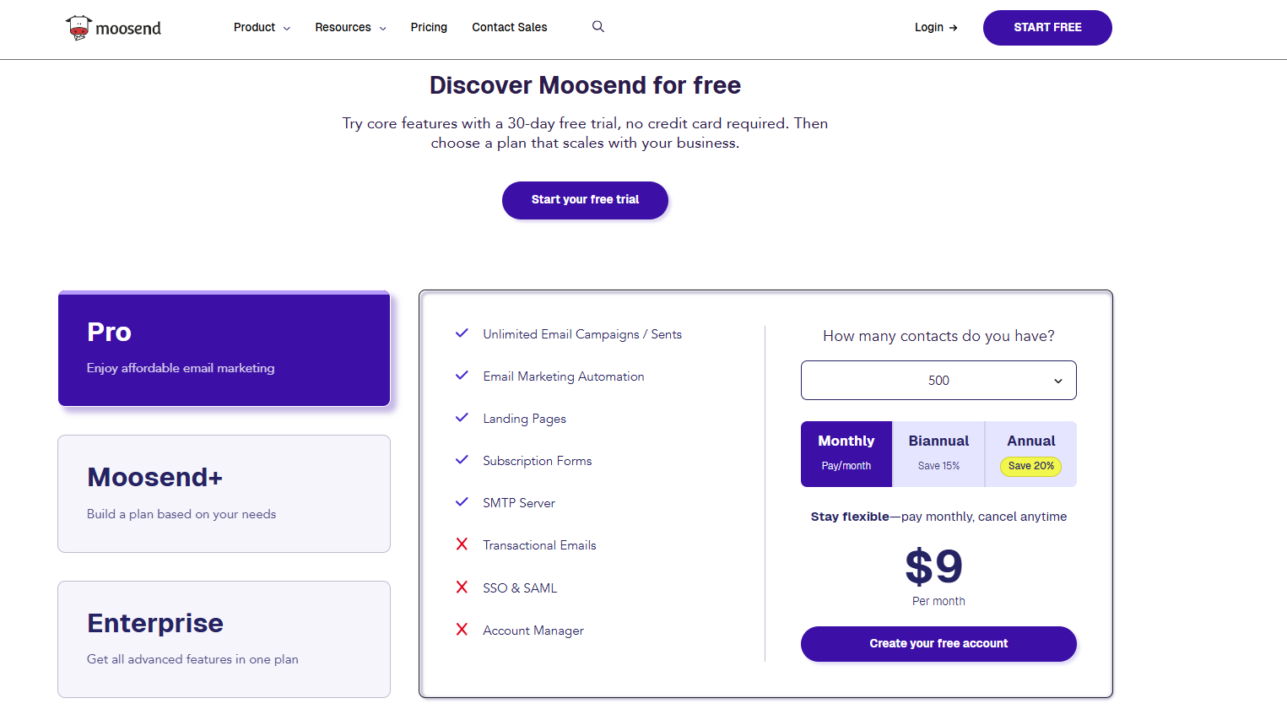 - Affordable pricing at $9/month (or $7/month for annual billing) and a custom plan (Moosend+) that allows you to pick premium features as add-ons.