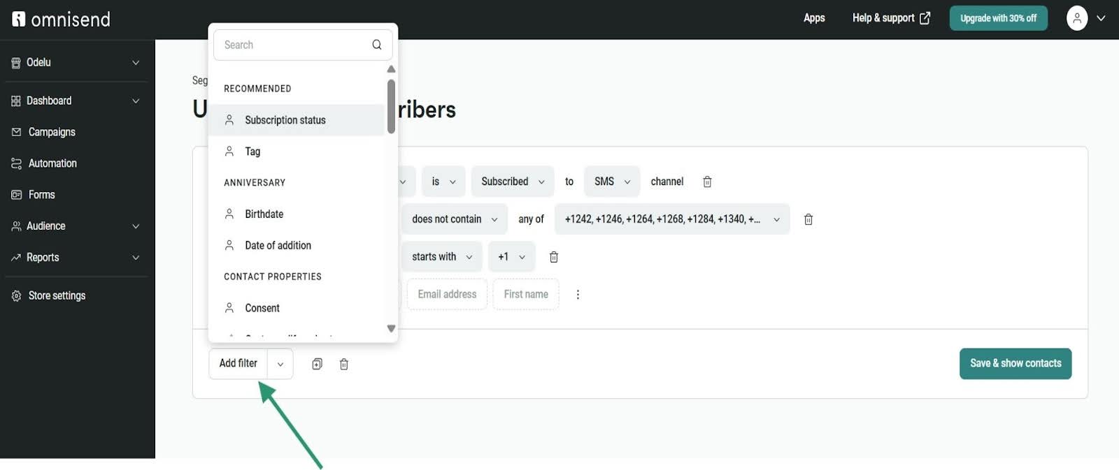Next, click Add filter to segment your audience using different criteria. When you’re done, click Save and show contacts to name your segment and view all customers within the selected range: