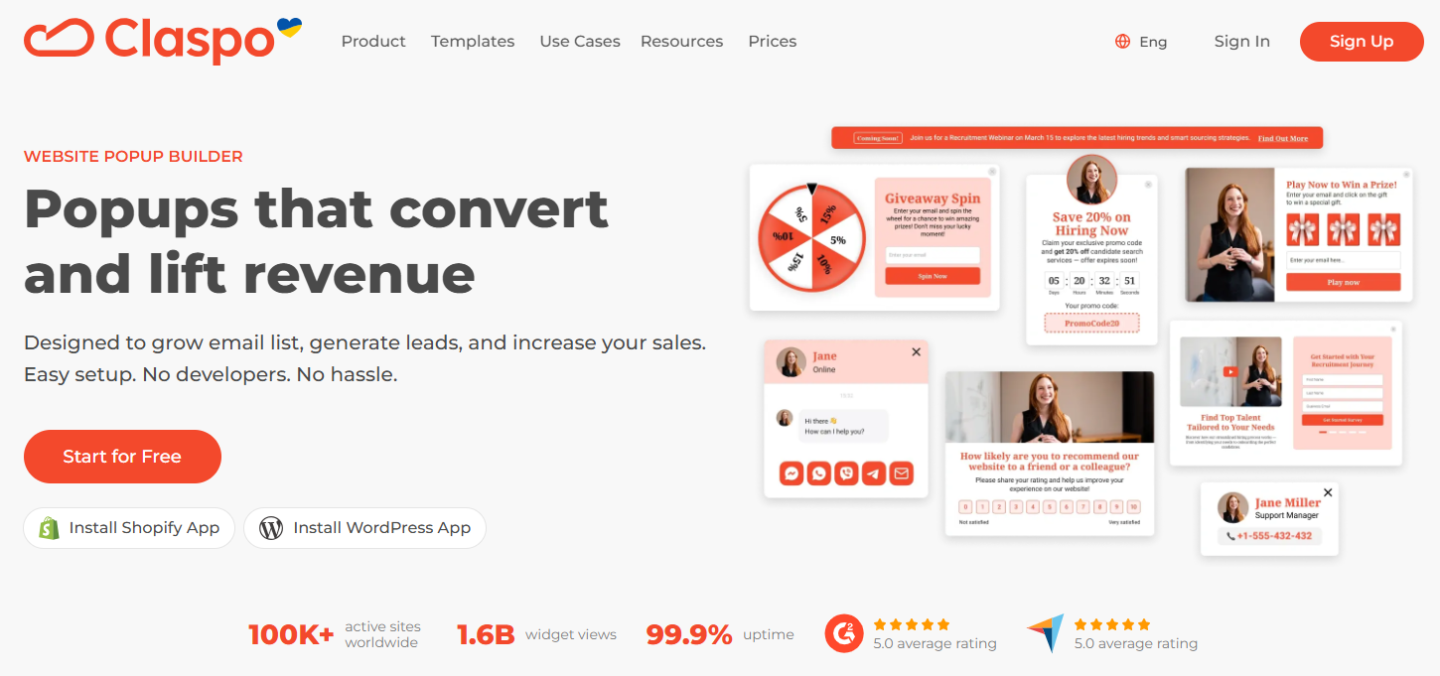 | Claspo | Lead capture | Drag-and-drop editor, gamified popups, advanced targeting and A/B testing |