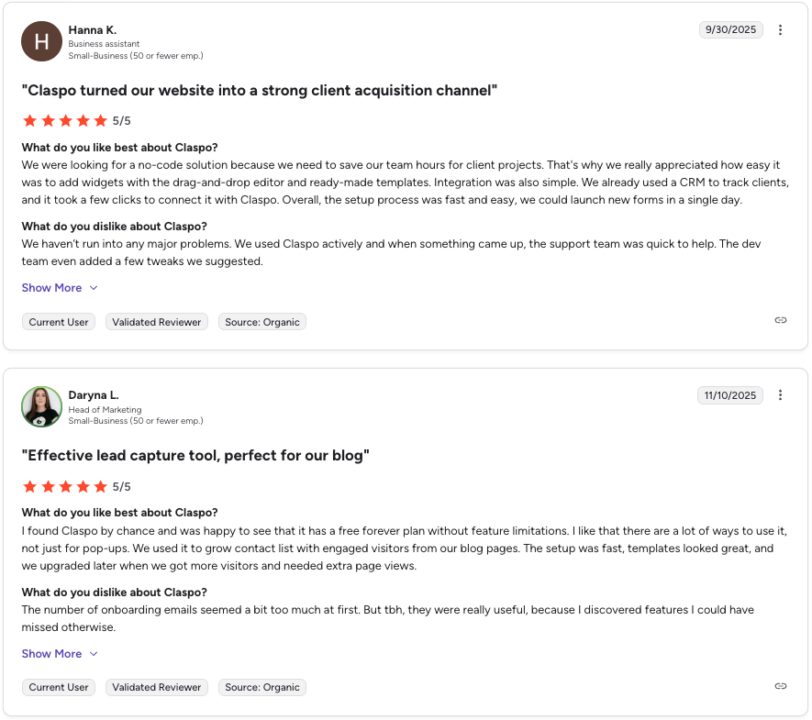 Users praise Claspo’s intuitive editor and flexibility, highlighting its ability to create engaging popups without technical skills.