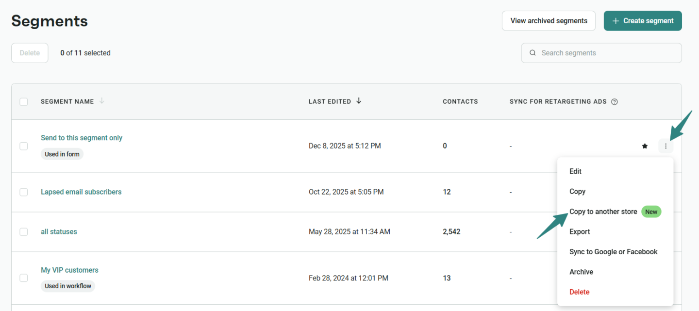 You can now copy a segment from one store to another — rename it on the way, pick multiple destination stores, and get it done in a few clicks. The only requirement is that all your stores run on the same ecommerce platform.