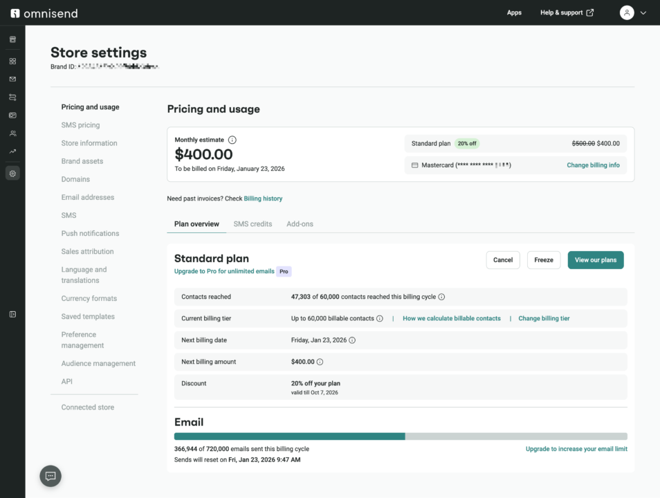 Everything else on the page is now neatly organized into three tabs: Plan Overview, SMS Credits, and Add-ons.