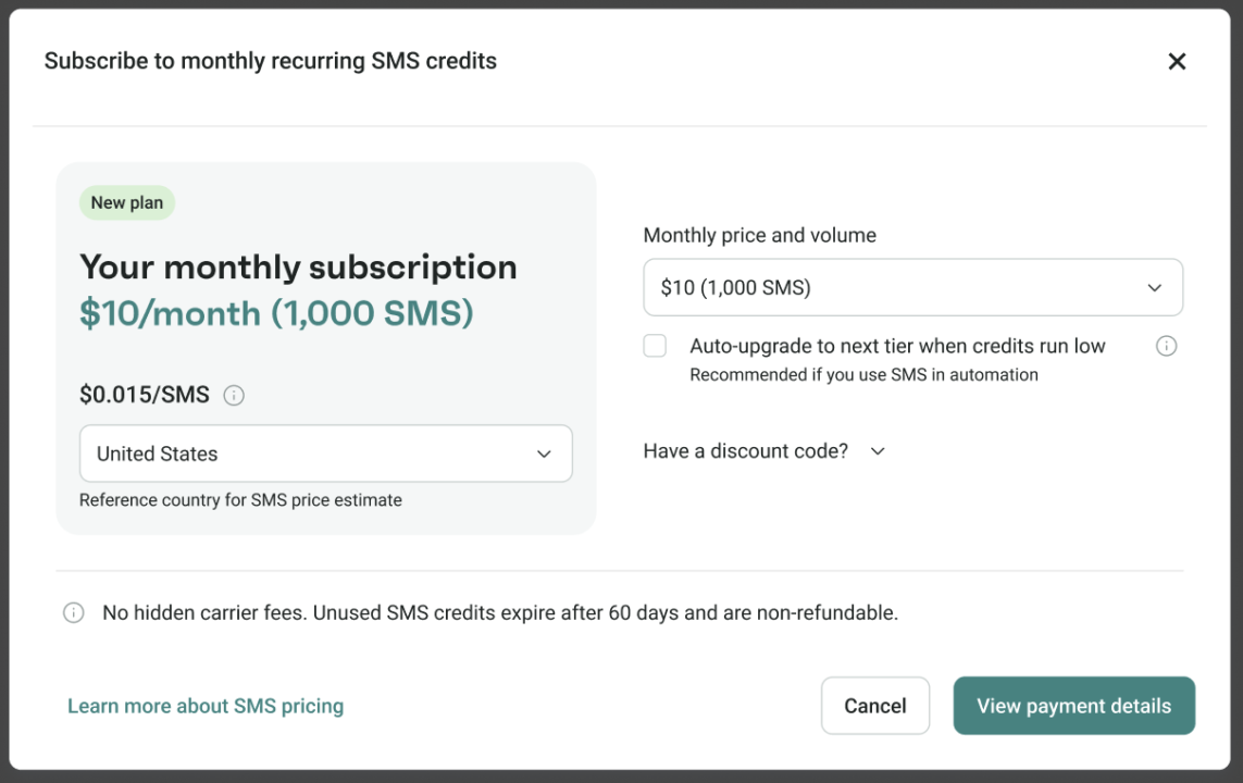 You now pick your monthly price and SMS volume first, then see the price per SMS based on your reference country. You can change the reference country on the fly to see how it affects your volume, auto-renewal options are always visible while you’re subscribing, and you can manage your SMS subscription directly from the SMS tab in Store settings → Pricing and usage.