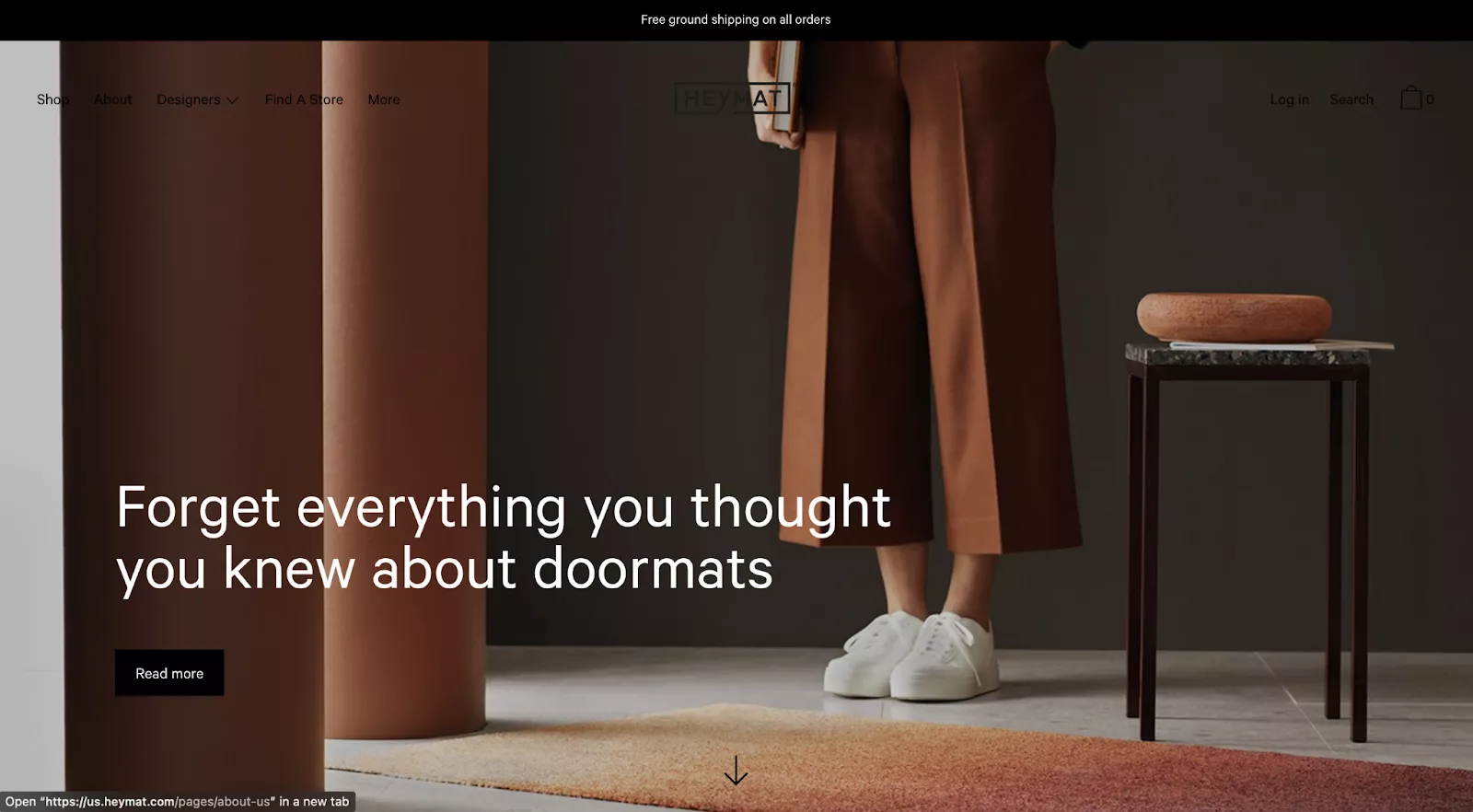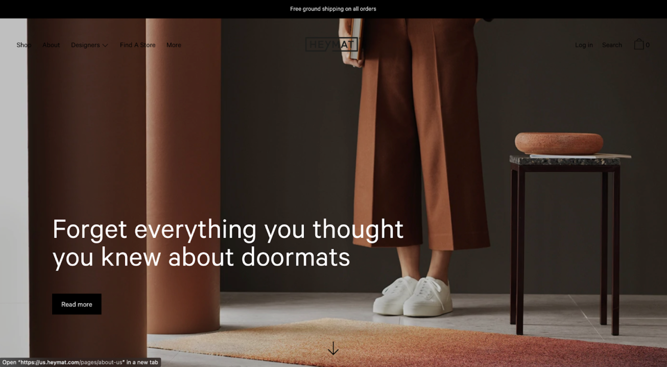 Rather than a specific product or offer, Heymat starts with a more general tagline that invites customers to find out what makes it different from other brands. Visitors can scroll down to view some of its designs or click the “Read More” button to learn more about its history and philosophy.