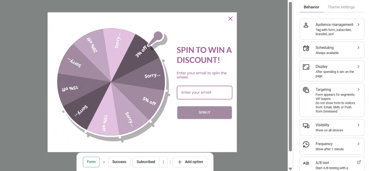 Now your Wheel of Fortune forms have even more flexibility. You can now remove the discount block, giving you greater control over how and when you deliver discounts to new subscribers. Instead of showing the discount directly on the form, you can choose to send it via an Email or SMS message in your Welcome Automation.
