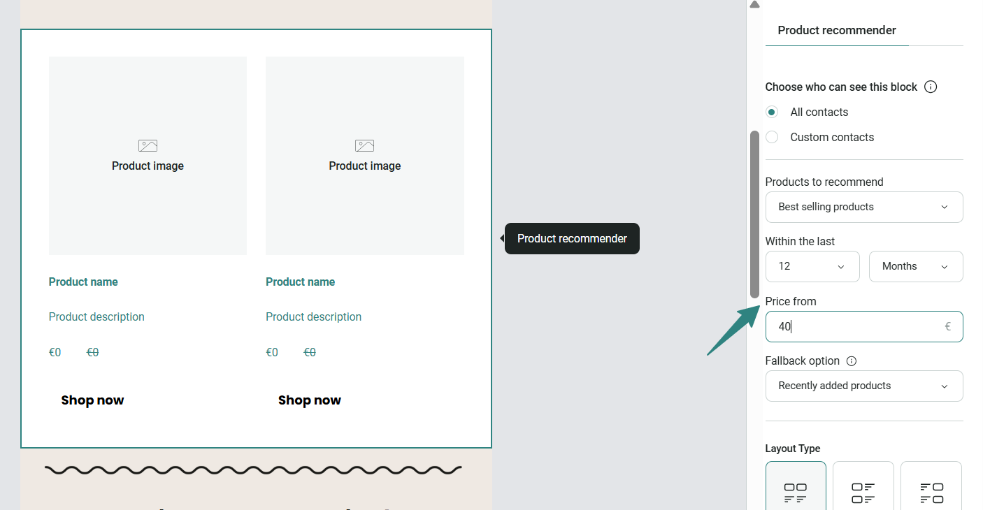 We have introduced a new option allowing you to control the minimum price of products recommended to your customers. You can now set a minimum “Price from” value directly within the Product Recommender block.