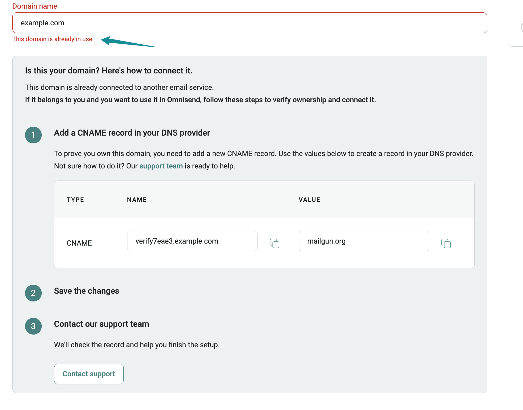 Troubleshooting the sender domain signature is now clearer and more actionable. Suppose you attempt to add a sender domain already connected to another Omnisend account or another service. In that case, you'll see clear in-app steps for troubleshooting this and authenticating your domain.