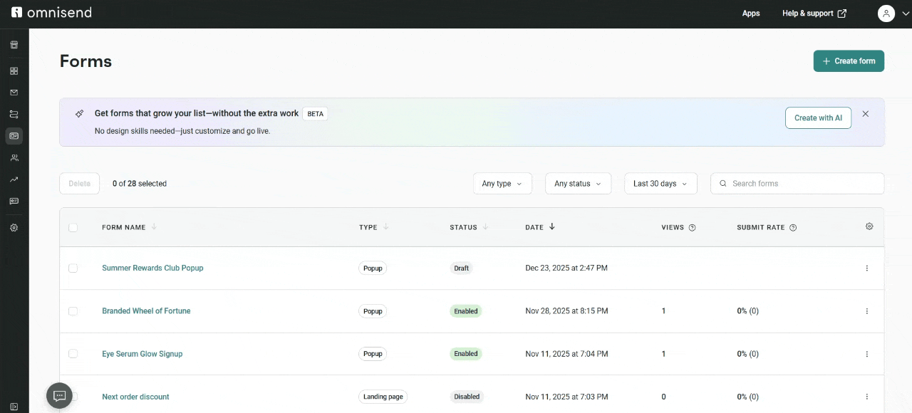 You’ve already been able to generate forms with AI, and now you can go one step further. With the AI Assistant available to all paid Omisend users, you can quickly create new versions of your forms. Simply describe what you’d like to change: text, style, images, or blocks, and AI will generate an updated version for you. You can also choose to retain your original targeting settings during the copy process.