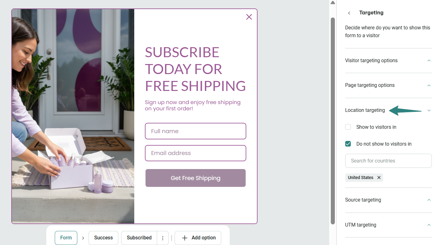 Forms can now be shown or hidden based on the visitor's country. Choose which countries you want the form to show or not show in, and Omnisend will automatically display or hide the form based on the visitor’s IP address.