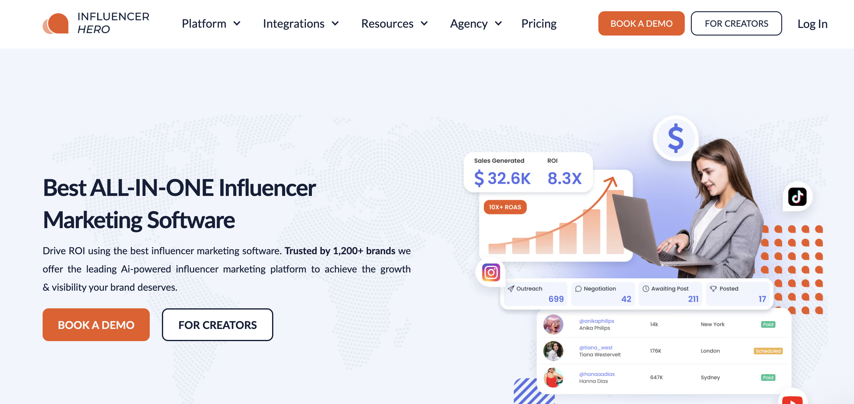 Influencer Hero is an all-in-one influencer marketing platform, covering influencer search, UGC capture, influencer CRM, and affiliate tracking.