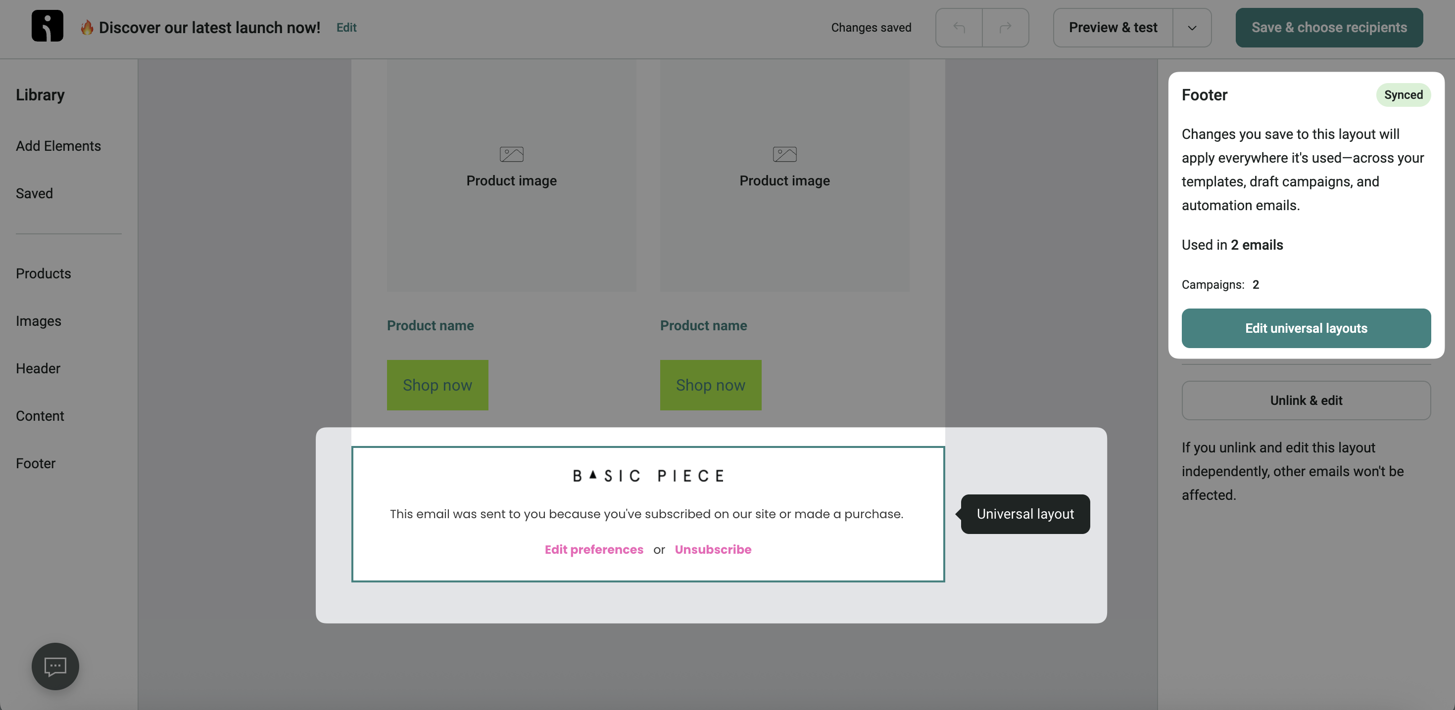 Universal Layouts work across your emails, allowing you to build and reuse components like headers, footers, or product blocks. When you drag them into a new email, you can choose to edit universally (so changes reflect everywhere) or edit independently to use them as unlinked layouts.