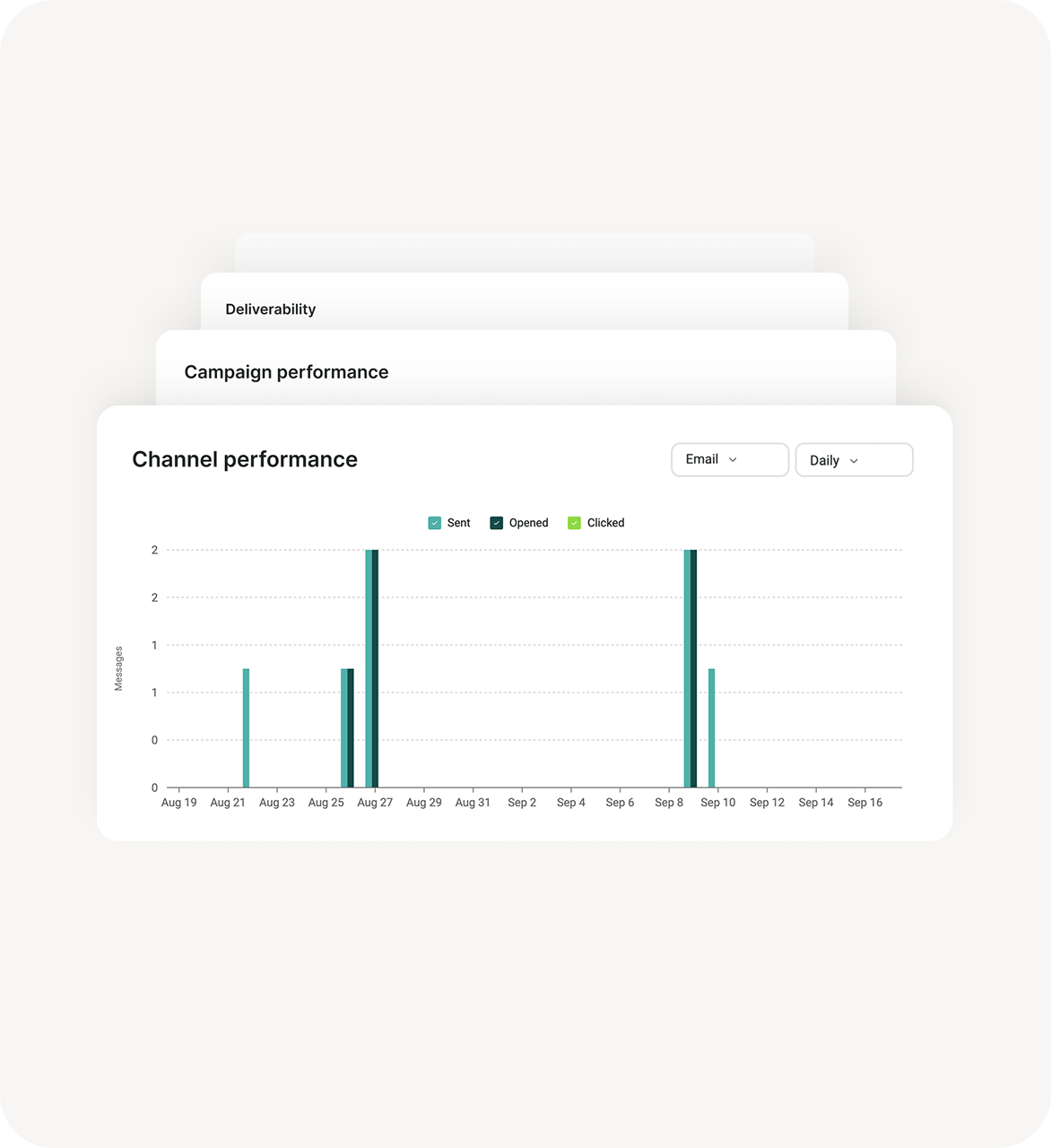 Filter performance by channel (SMS, email, more) to understand which messages drive results and where to optimize.