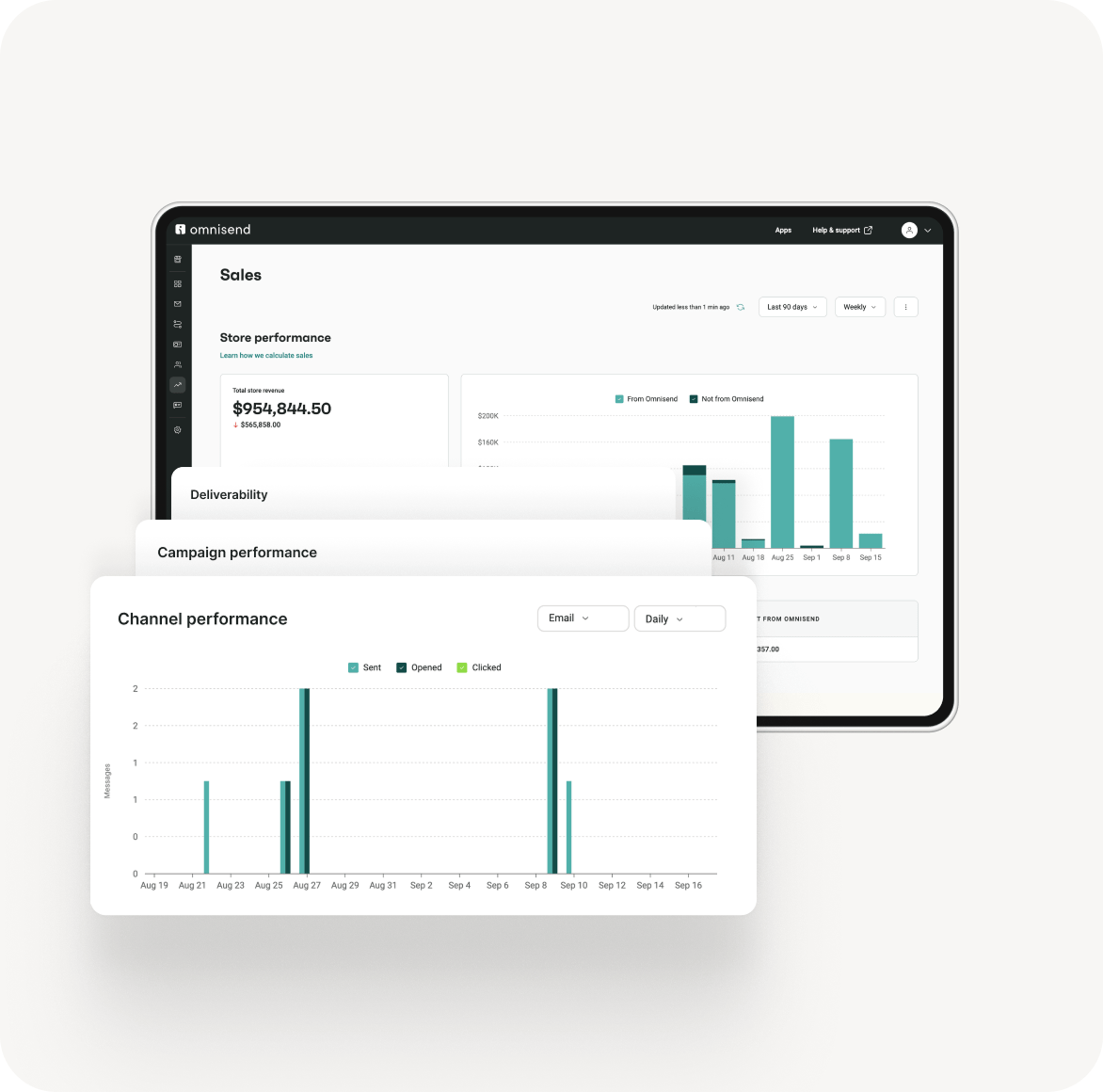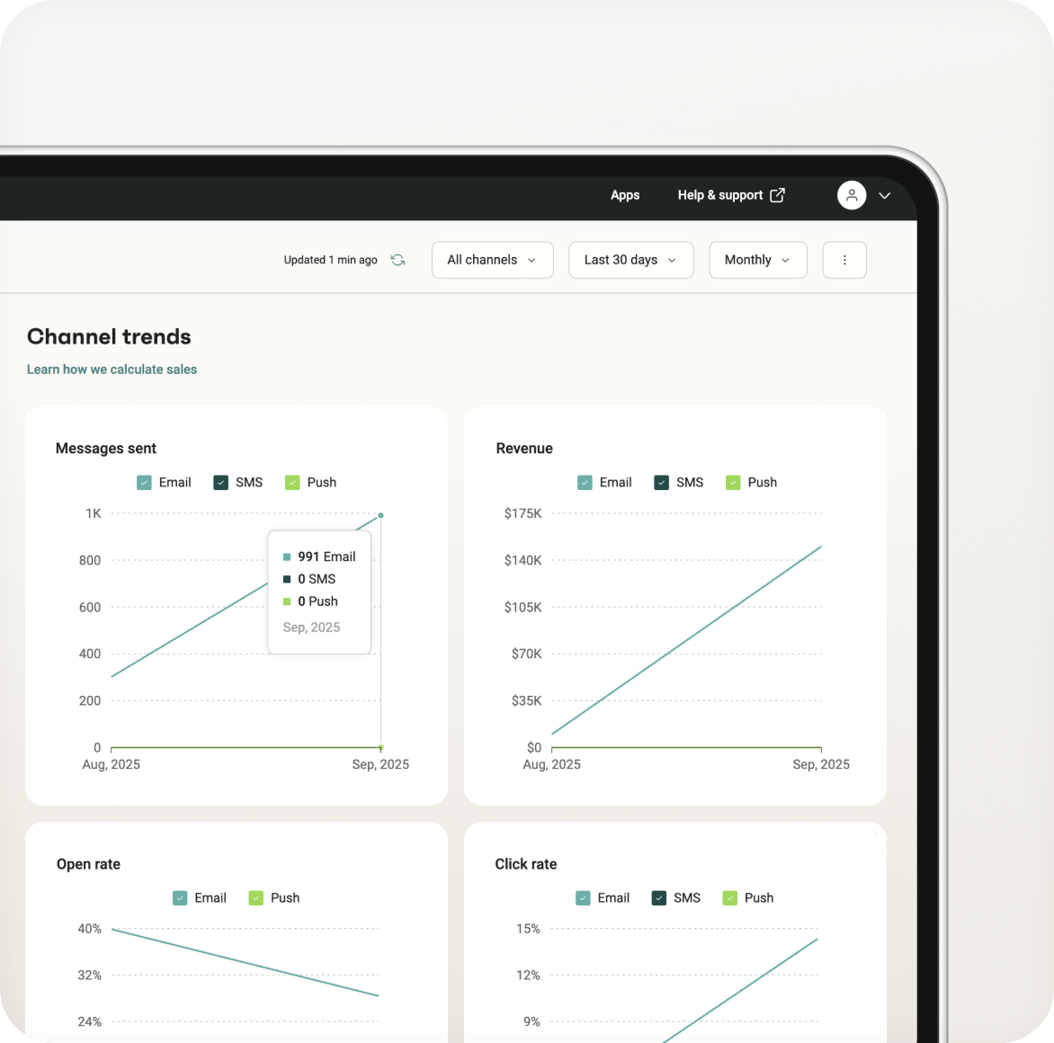 Running omnichannel campaigns is easier when you can see how each channel performs. Advanced Reporting splits KPIs by channel, so you can track results, compare performance, spot trends, and adjust your strategy without guesswork.