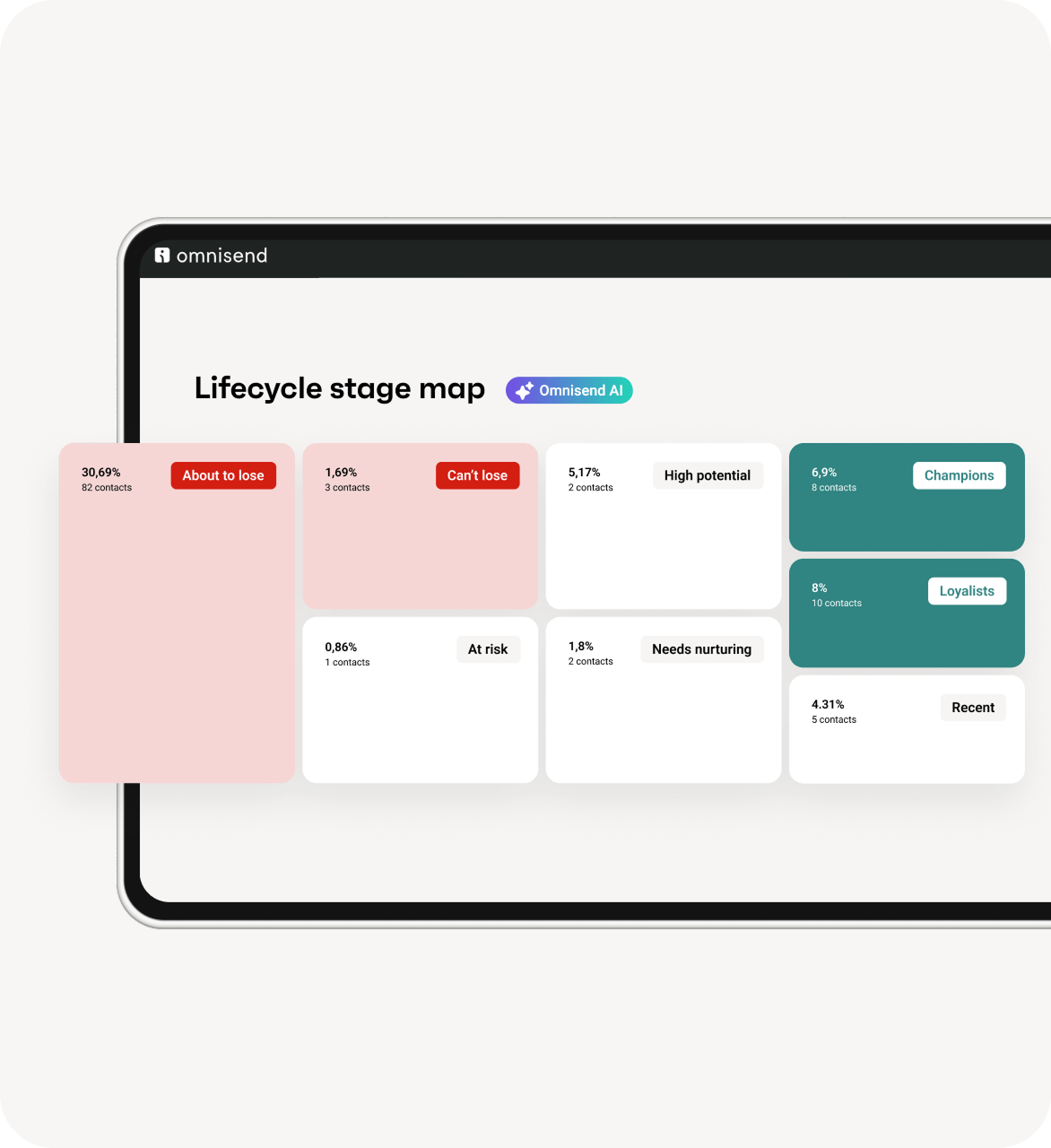 See your customers organized by lifecycle stage in a single, visual dashboard. With this view, you can instantly understand where each group sits — from new subscribers to loyal buyers to at-risk contacts.