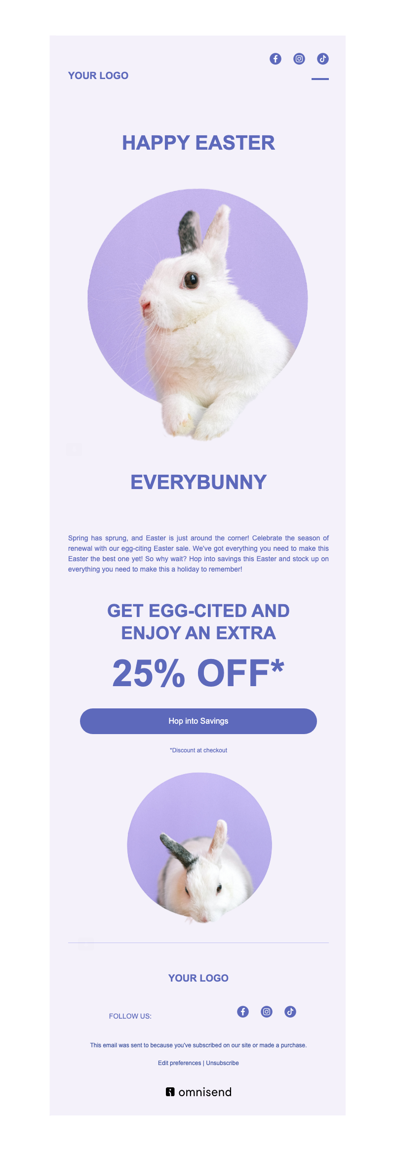 Your Easter email campaigns can include whatever you want, from your brand’s story to egg-cellent offers. And aside from promotions, Easter is a time to send warm wishes and connect with your audience on a personal level. Consider sending a simple, heartfelt Easter greeting email that expresses your appreciation for your subscribers and wishes them a peaceful Easter celebration. This small gesture can foster goodwill and strengthen your brand’s relationship with your audience.